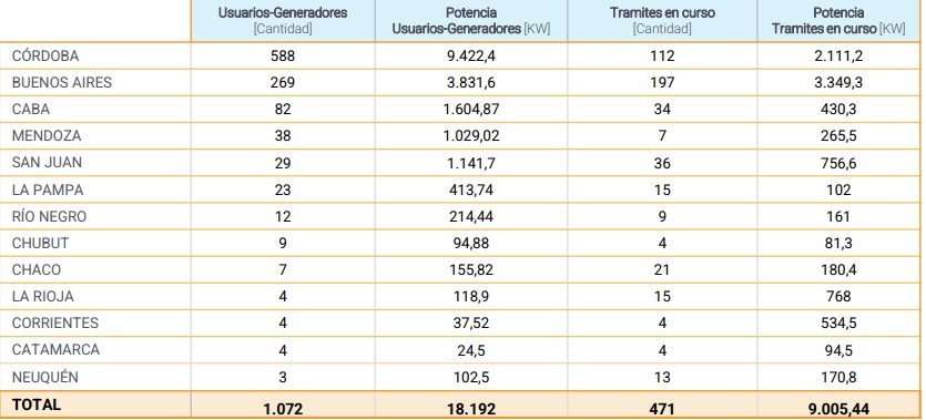 De acuerdo al último reporte de avance de la Secretaría de Energía de la Nación, durante diciembre se incorporaron 21 usuarios – generadores al sistema por un total de 447 kW de capacidad instalada y conectada a la red mediante un medidor bidireccional, dando un total de 1072 U/G y 18.192 kW.