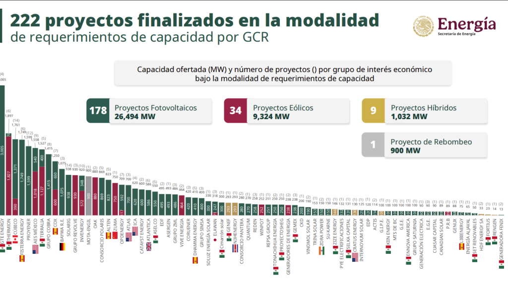 También aparecen entre los desarrolladores con mayor potencia registrada Fisterra Energy (ex Blackstone) con cerca de 1749 MW, Proyener con aproximadamente 1599 MW, AES México con 1558 MW, Terralia con cerca de 1527 MW, Grupo Cobra con 1415 MW, y Cox Energy, que supera los 1200 MW ofertados dentro del proceso.