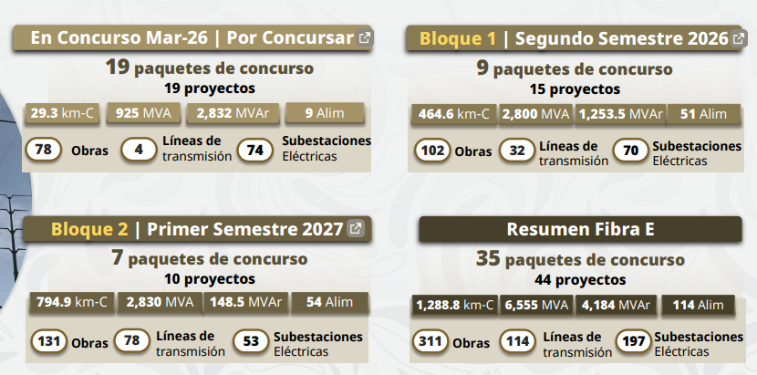 Tan solo en marzo de 2026, ya se encuentran en proceso cinco proyectos en concurso con una  inversión superior a 1,048 millones de pesos, mientras que en los siguientes meses se prevé licitar 14 adicionales por más de 6,700 millones de pesos, a través de financiamiento Fibra E.