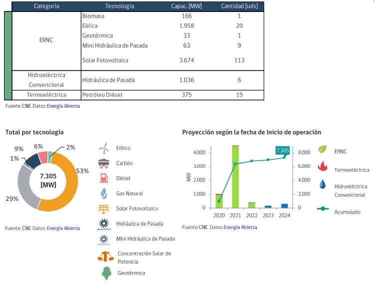 De acuerdo a las proyecciones de la CNE, los proyectos renovables no convencionales en construcción mencionados se pondrán en marcha durante este y el próximo año. En 2023 y 2024 entraría el grueso de las hidroeléctricas convencionales.