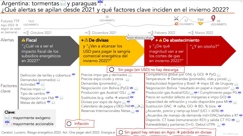 Varias señales de alarma se activaron durante los últimos seis meses, tanto a nivel local como internacional, en relación con la cobertura de la demanda de energía del invierno venidero. El consultor y analista energético Luciano Caratori elaboró un gráfico en el que reseñó dichas variables a lo largo de tres grandes escenarios: el de octubre de 2021, el de diciembre de ese año y el de febrero-marzo de 2022.