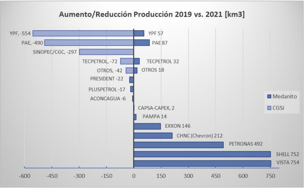 La producción de YPF cayó con fuerza en el Golfo San Jorge, donde perdió 554.000 m3 de petróleo desde 2019 a 2021.Fuente: Elaboración propia a partir de datos de la Secretaría de Energía.