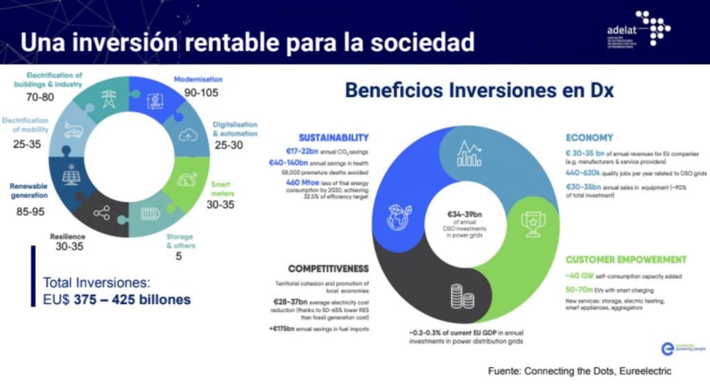 ¿Cuál es el nivel de inversión necesario? Según datos de Eureelectric y Connecting the Dots mencionados por el directivo de Adelat, Europa estima una necesidad de 400 mil millones de euros para su región que se invertirían en distintas categorías, como ser: digitalización, automatización, modernización, medidores inteligentes, generación renovable, resiliencia, almacenamiento y electrificación del sector de movilidad, edificios e industrias.