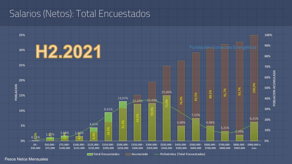El 56% de los trabajadores petroleros percibe un salario neto superior a los 300 mil pesos, según una encuesta realizada por la Fundación Contactos Energéticos entre 903 profesionales del rubro con datos correspondientes al segundo semestre de 2021.
