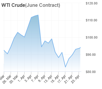 El miércoles, el valor de referencia Brent, para entrega en junio avanzó 2,99% hasta los US$ 101,40 por barril, mientras que el WTI trepó 3,18% hasta los US$ 92,52 dólares.}