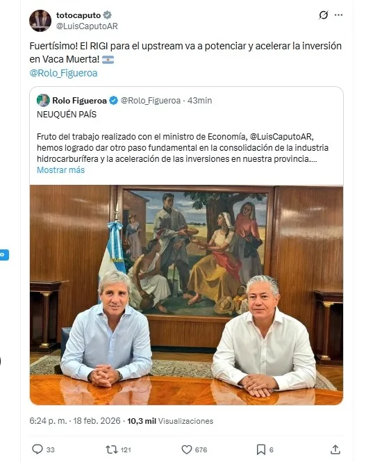 «Fuertísimo! El RIGI para el upstream va a potenciar y acelerar la inversión en Vaca Muerta!», escribió el ministro de Economía, Luis Caputo, en X al repostear un mensaje de Figueroa sobre el tema.