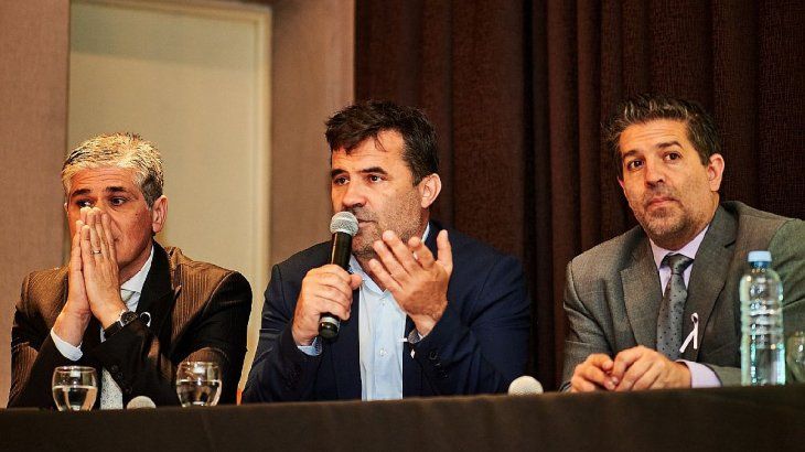 Martínez, flanqueado por Pablo González y Demian Panigo, durante una presentación con legisladores patagónicos en Santa Cruz.