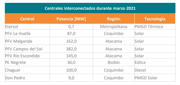 El informe precisa que han ingresado en operaciones cuatro grandes proyectos solares fotovoltaicos, tres ubicados en la Región de Atacama: Malgarida, de 162 MW; Campos del Sol, de 382 MW, y Rio Escondido, de 145 MW. El restante se encuentra en Coquimbo y se trata de La Huella, de 87 MW. En esa misma región también se ubica un PMGD solar: Don Pedro, de 9 MW. Y además se registra un eólico en Biobío: Negrete, de 36 MW.