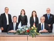 En la foto (De izquierda a derecha): Marcos Bulgheroni, Group CEO de PAE; Rodolfo Freyre, Presidente de SESA; Betina Pasquali de Fonseca, embajadora argentina en la República Federal de Alemania; Doris Honold, miembro del Consejo de Supervisión de SEFE, Frédéric Barnaud, CCO de SEFE; Dr. Egbert Laege; CEO de SEFE.