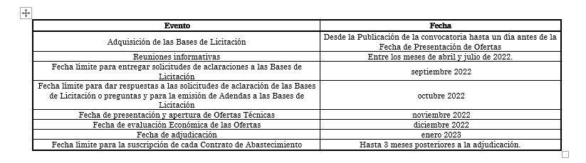 Según información a la que pudo acceder este medio, en Las Bases de Licitación se mantendría igual que en Los Términos de Referencia el cronograma de hitos a cumplirse mes a mes hasta dar con los ganadores del proceso licitatorio en enero del año 2023.