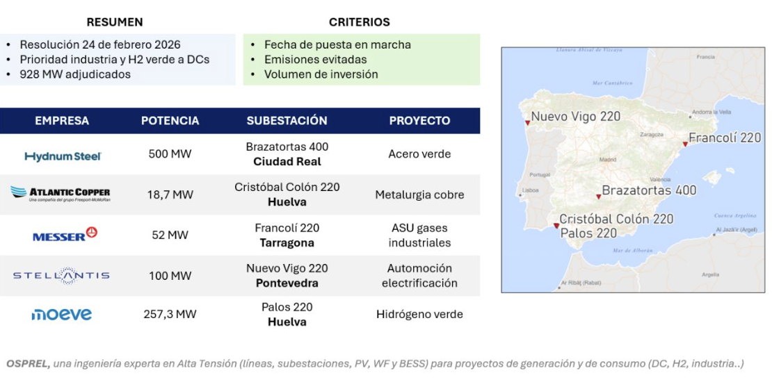 Las adjudicaciones se concentraron en los nudos Brazatortas 400 (Ciudad Real), Cristóbal Colón 220 (Huelva), Francolí 220 (Tarragona), Nuevo Vigo 220 (Pontevedra) y Palos 220 (Huelva). Entre los proyectos destacan Hydnum Steel con 500 MW para su iniciativa de acero verde en Puertollano, Moeve con 257,3 MW vinculados al Valle Andaluz del Hidrógeno Verde,electrificación de planta de automoción de Stellantis en Vigo, además de desarrollos industriales impulsados por Atlantic Copper y Messer.