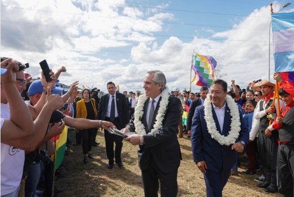 El presidente Alberto Fernández inauguró hoy en la localidad de Yaguacua, en Bolivia, junto a su par Luis Arce, el electroducto Juana Azurduy de Padilla, la primera vinculación eléctrica entre ambos países que permitirá mejorar el abastecimiento de energía y favorecer su suministro a las poblaciones de zonas fronterizas.