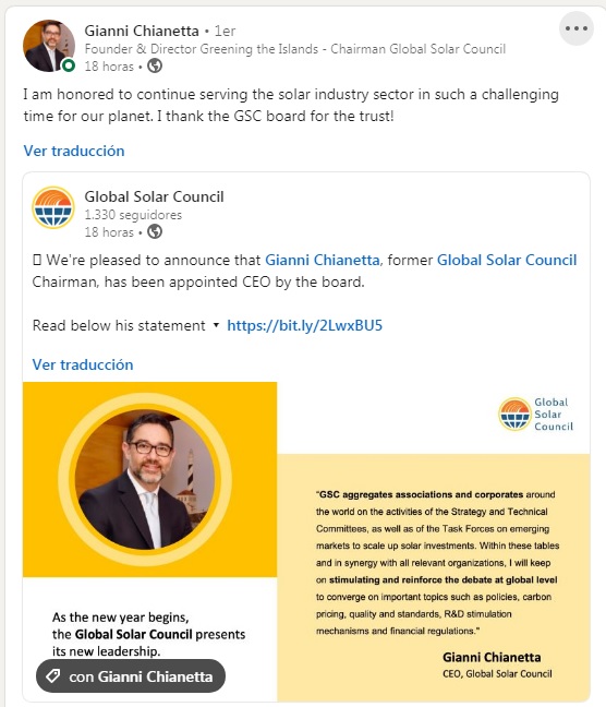 «Me siento honrado de seguir sirviendo al sector de la industria solar en un momento tan difícil para nuestro planeta. Agradezco a la junta de la SGC por la confianza», declaró en sus redes sociales Gianni Chianetta, tras ser designado CEO del Global Solar Council.