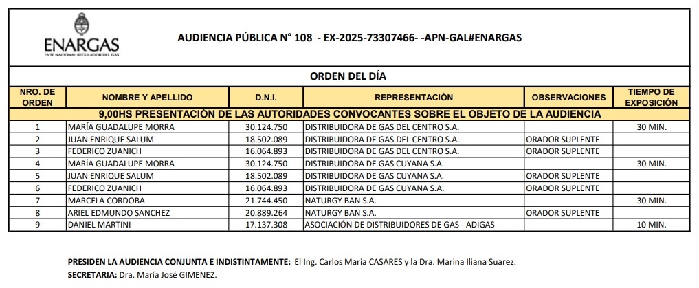 El 20 de mayo de este año fue el turno de la audiencia pública para tratar la extensión de las concesiones de las distribuidoras Metrogas, Litoral Gas y Camuzzi Gas Pampeana. Allí hubo quince inscriptos, entre los cuáles estuvieron Pedro Bussetti, titular de Defensa de Usuarios y Consumidores (DEUCO), y María José Lubertino, de la Asociación Ciudadana por los Derechos Humanos. Este jueves fue el turno de Naturgy Ban, Distribuidora de Gas del Centro y Distribuidora de Gas Pampeana, pero solo expusieron 3 personas: Juan Enrique Salum en representación de Distribuidora de Gas del Centro y Distribuidora de Gas Cuyana, ambas propiedad de Ecogas Inversiones, empresa controlada por Central Puerto; Marcela Claudia Córdoba, de Naturgy Ban, subsidiaria por la española Naturgy; y Daniel Martini, directivo de la Asociación de Distribuidores de Gas.
