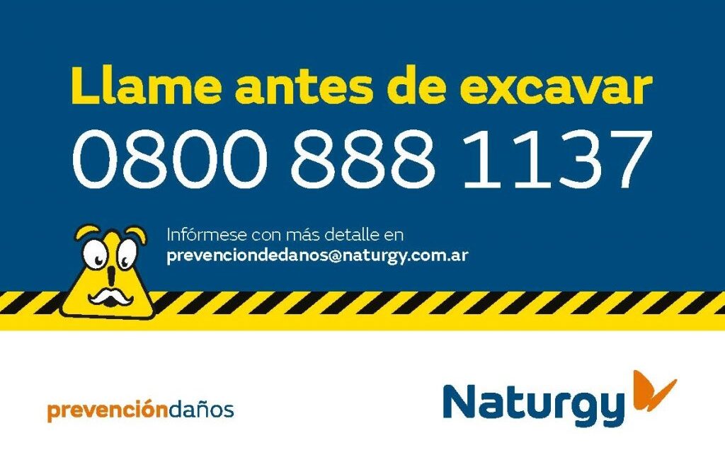 La empresa dispone de una línea telefónica gratuita 0800-888-1137 y un correo electrónico (prevenciondedanos@naturgy.com.ar) dónde deberán dirigirse las consultas para interiorizarse respecto de la ubicación de las redes subterráneas en el terreno elegido, para evitar así roturas que pongan en riesgo la salud de los trabajadores actuantes, de los vecinos aledaños, de las viviendas y los bienes.