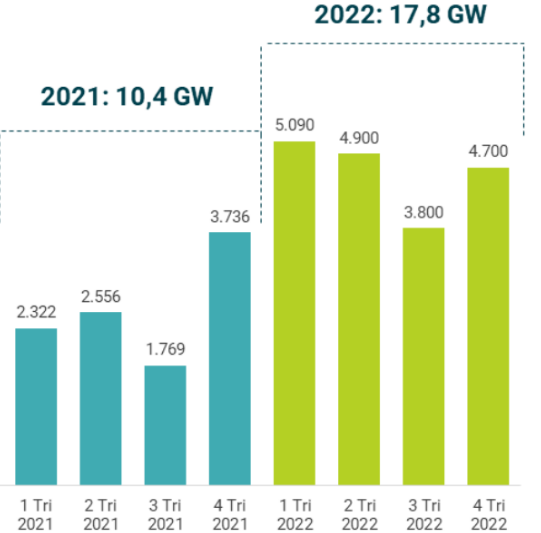 De acuerdo al Estudio Estratégico de Generación Distribuida, la evolución de este mercado puede estar representada por la cantidad de módulos fotovoltaicos demandados. El Estudio señaló que el volumen importado superó los 17 GW durante 2022. Ese valor fue un 71% superior en comparación con 2021, lo que indica inversiones superiores a R$ 64 mil millones.