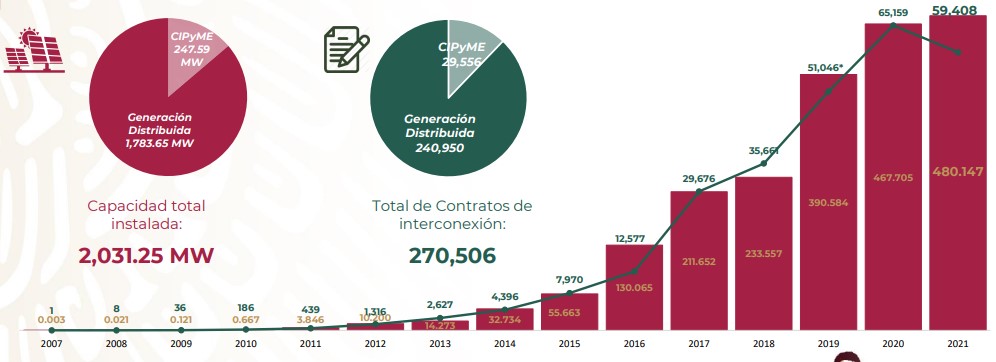 De este modo, México sobrepasó los 2 GW de capacidad operativa bajo este segmento. Precisamente posee 2,031.25 MW bajo 270,506 acuerdos de interconexión, cifra que supone una inversión de 3,515.22 millones de dólares, siendo los últimos tres años los de mayor crecimiento.