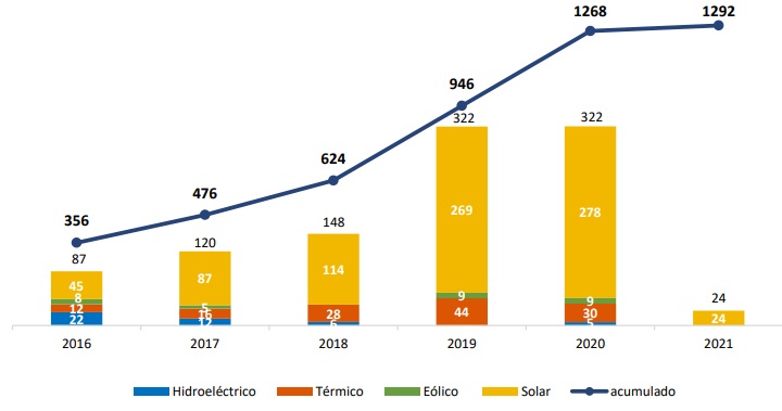 Allí se indica que la potencia total de estos proyectos de hasta 9 MW llegó a los 1.292 MW, un 362% de lo que había instalado hace cuatro años.