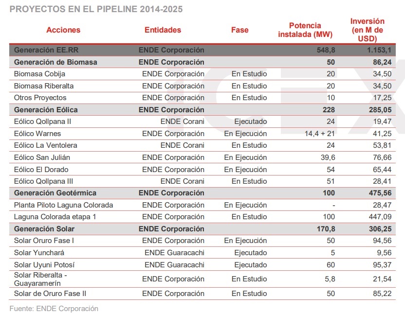 No obstante a ello, el Gobierno ha manifestado que diversificará su matriz eléctrica. Lo haría a través de su Plan Eléctrico del Estado Plurinacional de Bolivia – 2025. Este programa contempla el avance de proyectos (en diferentes etapas) por 548 MW de energías renovables, a través de una inversión de 1.153,1 millones de dólares.
