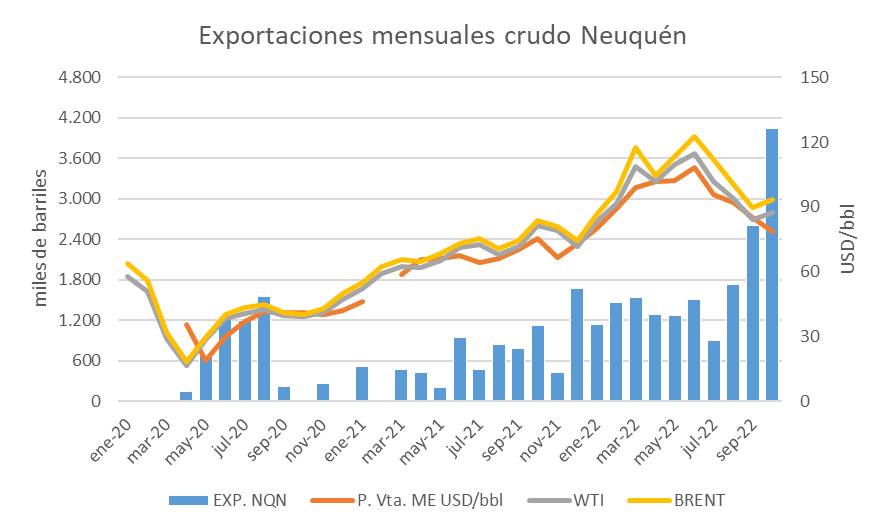 Durante el mes de diciembre, se exportaron unos 2,28 millones de barriles de petróleo, lo que representó un 24% de la producción provincial, por cerca de US$ 162,5 millones, a un precio promedio que rondó los US$ 71 por barril (US$/bbl). En 2022, se acumularon envíos por 22 millones de barriles, 22 % de la producción provincial, significando poco menos de US$ 2.000 millones.
