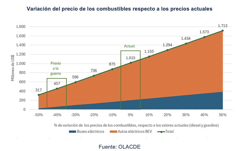 En términos nominales, mover un auto eléctrico hoy es USD 2 018 más barato al año que uno de gasolina; una brecha que se ensancha drásticamente si el crudo sigue al alza: ante un incremento del 50% en los combustibles, este ahorro anual escalaría a los USD 3 308.