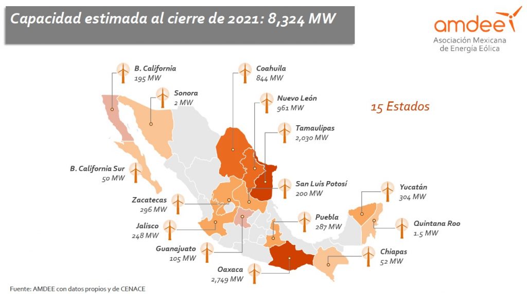 Es preciso mencionar que la potencia eólica instalada en el país supera los 8 GW gracias a sesenta y nueve parques eólicos operativos en quince Estados (la región noreste abarca posee de 3.8 GW), representando el 8.6% del total de capacidad de México, según detallaron desde AMDEE.
