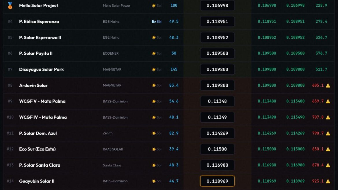 Entre los posibles proyectos adjudicables se destacan Parque Solar Taíno I (84,7 MW), FV Botoncillo (44,2 MW) y Mella Solar Project (100 MW), todos con los precios más competitivos del proceso (inferiores a USD 0,107 x kWh).