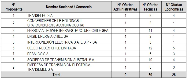 Transelec presentó 8 ofertas (4 económicas); Empresa de Transmisión Eléctrica (Transemel) y Belsaco se postularon con 5 cada una, (ambas con 3 económicas); Interconexión Eléctrica (ISA) y Concesiones Chile Holdings II (Consorcio Acciona Cobra), 3 cada una (y 1 oferta económica cada una); y Engie Energia Chile 2 ofertas (1 económica).