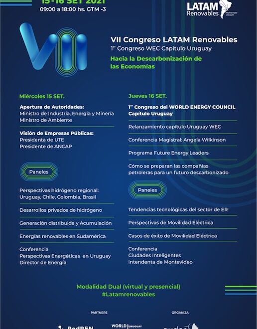 Bajo el lema “Hacia la descarbonización de las economías”, este evento convoca a altos referentes internacionales como Angela Wilkinson, CEO y secretaria general del WEC, autoridades locales como Fitzgerald Cantero, director nacional de energía en MIEM, y ejecutivos de asociaciones civiles y empresarias de las energías renovables en Latinoamérica, tales como CADER (Argentina) y ACERA (Chile).