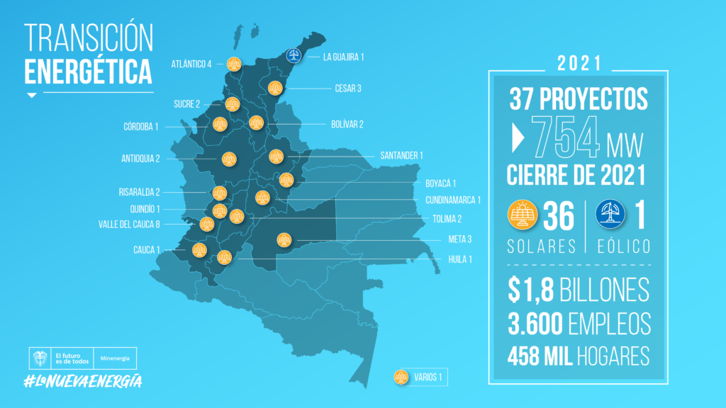 “La Transición Energética de Colombia seguirá imparable en 2021. La meta en materia de incorporación de energía solar y eólica es llegar a los 37 proyectos nuevos conectados que representan 530 megavatios de capacidad instalada adicional, equivalentes al consumo de más de 450.000 hogares. De ellos, 36 serán solares, y uno más será eólico; el primer parque puesto en operación en este Gobierno, en el departamento de La Guajira”, agregó el Ministro de Minas y Energía, Diego Mesa.