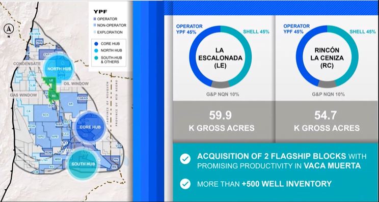 *Acuerdo con TotalEnergies. Alineados con la misma lógica de cartera de asegurar valor de largo plazo para la compañía, esta semana firmamos un acuerdo de licitación para adquirir áreas de primer nivel de Total por US$500 millones sujeto a ciertas condiciones. En este caso, los bloques La Escalonada – Rincón de La Ceniza se ubican en la zona más prometedora de la ventana de petróleo y gas húmedo de Vaca Muerta, cerca de los bloques Bajo del Choique-La Invernada que Pluspetrol adquirió recientemente de Exxon. Esperamos asumir el rol operativo de estos dos bloques, con una participación del 45%, en asociación con Shell y Gas y Petróleo con un inventario de más de 500 pozos activos cuyos primeros perforados muestran niveles de productividad muy prometedores.