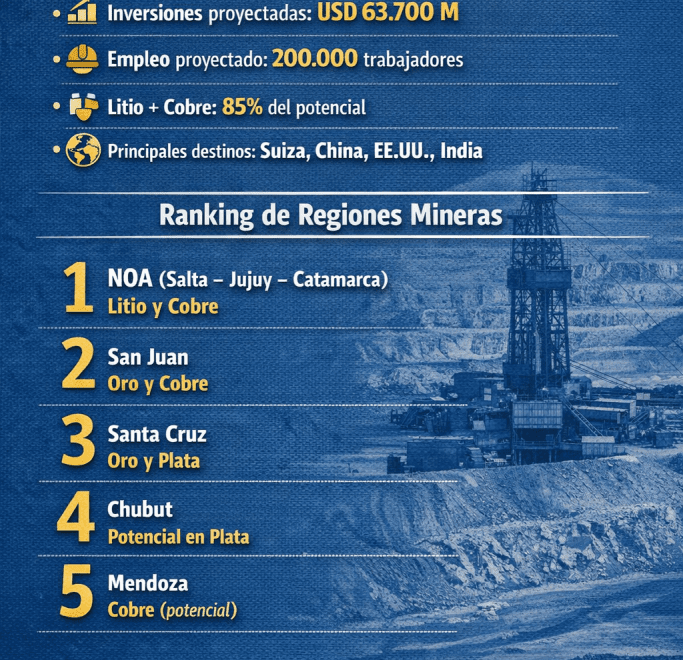 El avance del ciclo minero argentino muestra una concentración territorial clara: tres regiones explican la mayor parte de las exportaciones, del empleo y de las inversiones proyectadas hacia 2035.