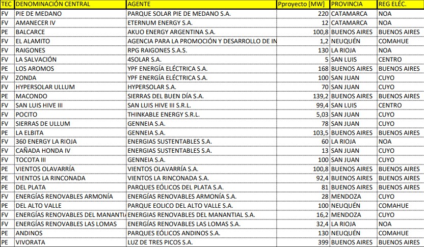 En resumen, la región eléctrica de de Comahue – Patagonia – Buenos Aires en la que concentra mayor cantidad de emprendimientos (11) y prioridad de despacho solicitada, dado que los diez proyectos eólicos se presentaron en dicha zona, además del parque solar El Alamito (1,2 MW), acumulando así un total de por un total de 1.415,90 MW (1.184,70 MW en Buenos Aires y 231,20 MW en Comahue).