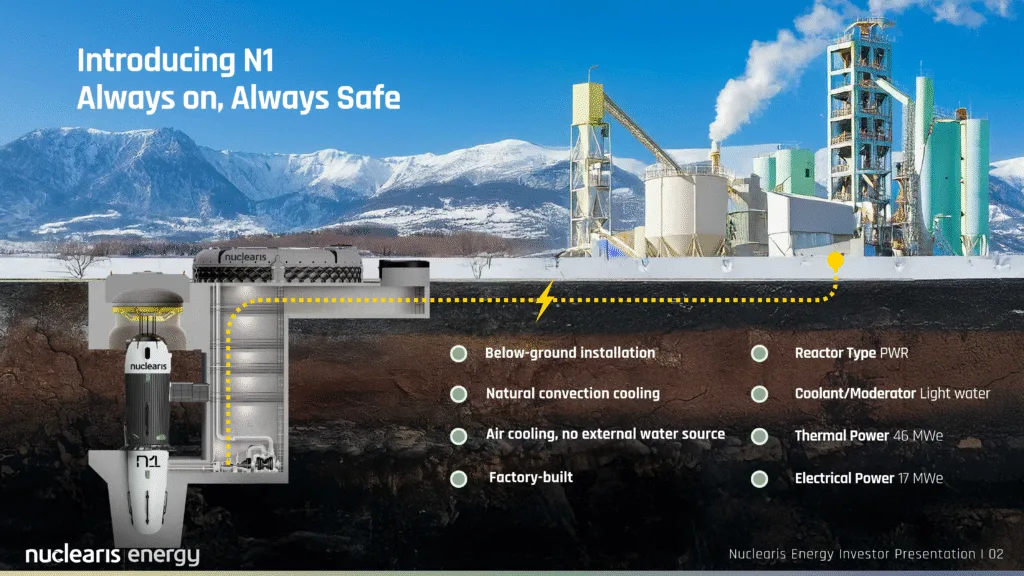 El N1 es un reactor modular micro de 17 MWe que utiliza como combustible uranio enriquecido por debajo del 5%. El reactor puede generar electricidad durante 20 años y su diseño no contempla la posibilidad de recambio de los combustibles. Lejos de ser una desventaja, esta última característica forma parte de una filosofía de diseño que persigue el abaratamiento de los costos vinculados con el combustible nuclear en el segmento de microrreactores. En concreto, Nuclearis impulsa un diseño que privilegia la reducción de gastos de capital y de operación al transformar al reactor en su propio almacenamiento del combustible gastado luego de 20 años de operación.