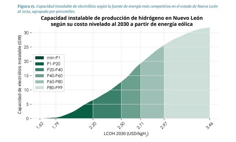 En efecto para 2050, Nuevo León tendrá un potencial de 95 GW de electrólisis con un costo menor a 2 USD/kg y cerca de 6.3 GW con un costo menor a 1.5 USD/kg para hidrógeno verde producido utilizando energía eólica.