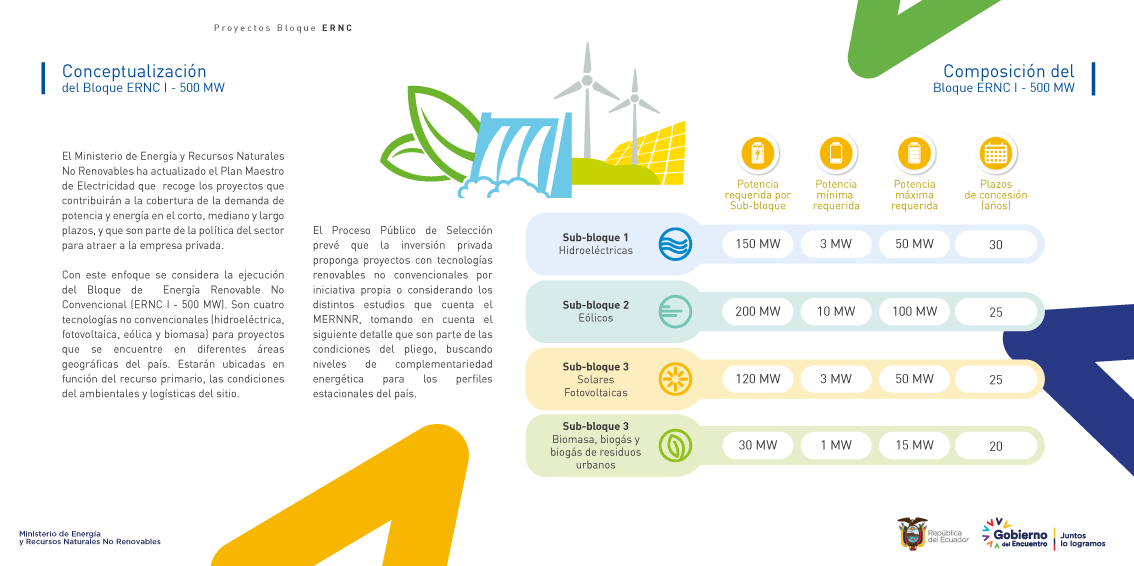 El Ministerio de Energía y Recursos Naturales No Renovables informó en un comunicado del inicio de tres «procesos públicos de selección», para la «concesión al sector privado de la construcción, operación y mantenimiento» de dichos proyectos.