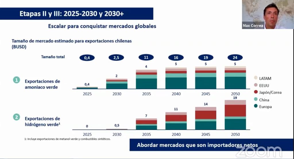 Las otras dos etapas corresponden, a, por un lado, la exportación de amoníaco verde; por otro, la exportación de hidrógeno verde (donde también se incluye el metanol verde y combustibles sintéticos).