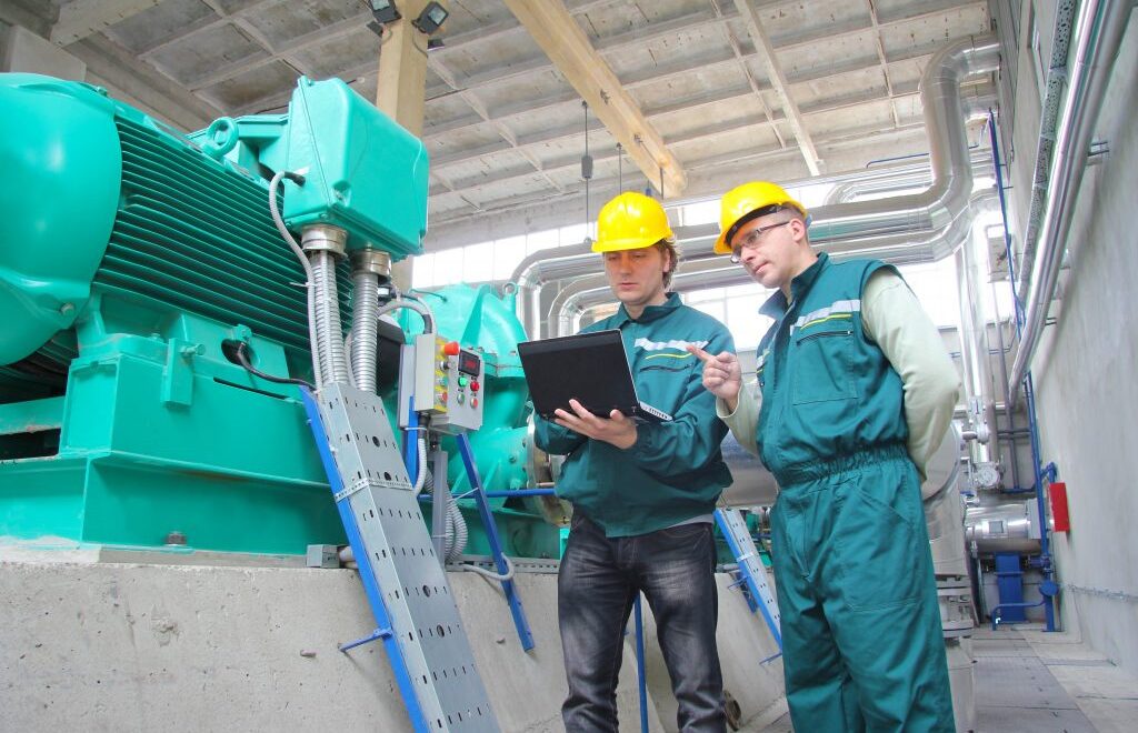 Industrial workers with notebook, teamwork