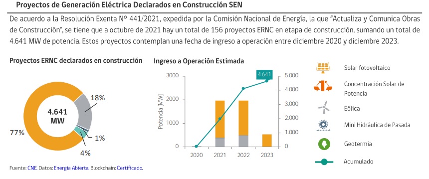 Sin embargo, según el último reporte de la Comisión Nacional de Energía (CNE), a octubre de este año se contabilizan 156 proyectos de energías renovables en construcción, por 4.641 MW, de los cuales casi 4.000 MW ingresarán en operaciones durante lo que resta de este año y el 2022.