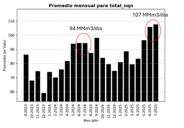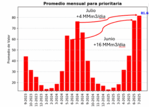 Como se muestra en el siguiente gráfico, junio de 2025 fue un mes de alto consumo prioritario, impulsado por las bajas temperaturas. Sin embargo, es importante destacar la magnitud del incremento: el consumo creció más de un 25% en comparación con el mismo mes de 2024, lo que representa una demanda adicional de 16 millones de metros cúbicos diarios (MMm³/día).