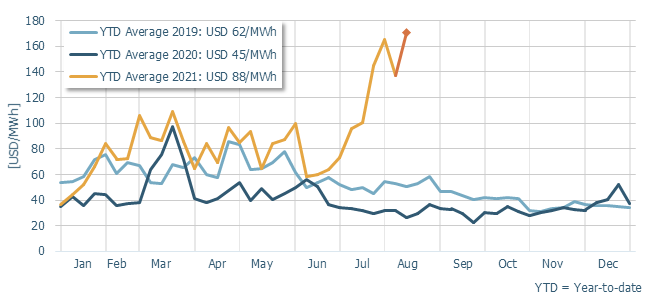 En el reporte se señala que todos estos fenómenos han hecho que los precios de la energía eléctrica en Alto Jahuel (centro del país) fueran un 25% más altos que los de la semana anterior (del 26 de julio al 1 de agosto) y un 548% más altos que hace un año, alcanzando así los 250 dólares por MWh.
