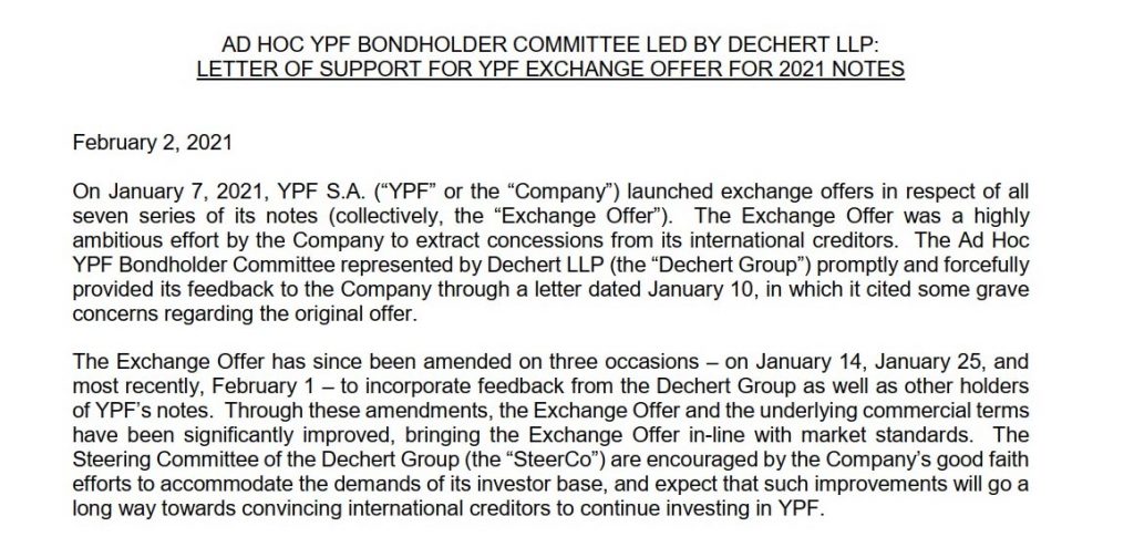 El Comité Ad Hoc de Tenedores de Bonos de YPF representado por el estudio Dechert respaldó la oferta de reestructuración de YPF. A través de un comunicado, este grupo que concentra el 25% de los títulos en cada una de las siete series aseguró que la mejora de la oferta que realizó la petrolera “merece una seria consideración por parte de los tenedores de las Obligaciones Negociables 2021”.