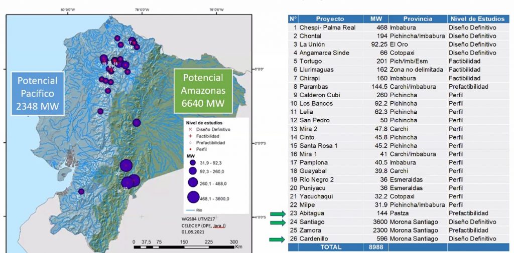 Gonzalo Uquillas, gerente general de la Corporación Eléctrica del Ecuador (CELEC EP), identificó dentro de su portafolio de proyectos al menos 26 hidroeléctricas que en total suman 8988 MW de potencia por instalarse en los próximos años. En la vertiente del Pacífico, se relevaron 2348 MW; mientras que, en la vertiente del Amazonas unos 6640 MW.